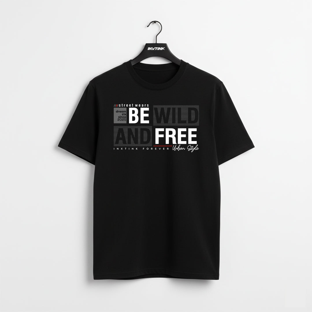 Regular fit 100% cotton black T-shirt featuring an urban typography design with the bold message “Be Wild and Free.”