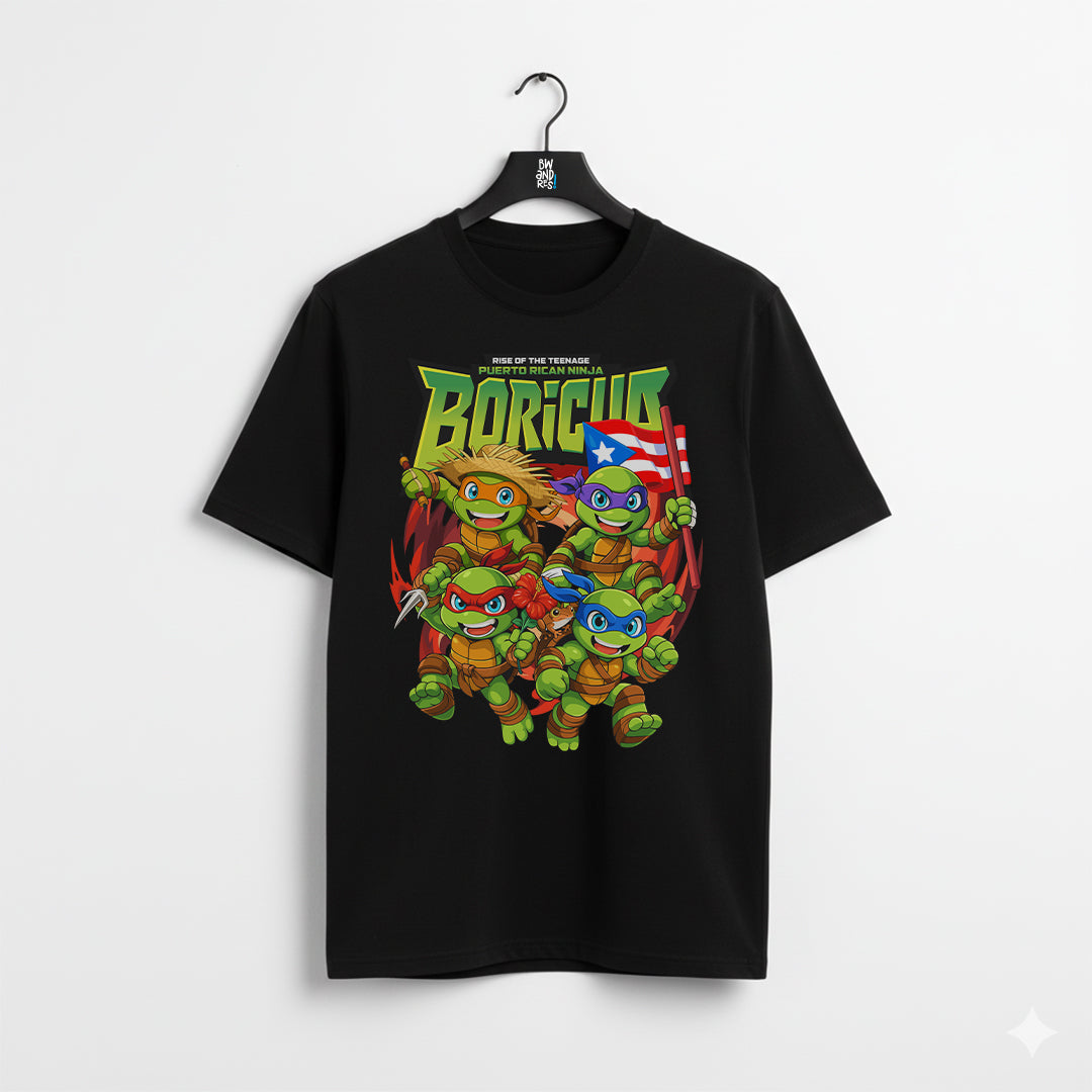 Regular fit 100% cotton black T-shirt featuring an exclusive Boricua Ninja design, inspired by the Teenage Mutant Ninja Turtles with a Puerto Rican twist.