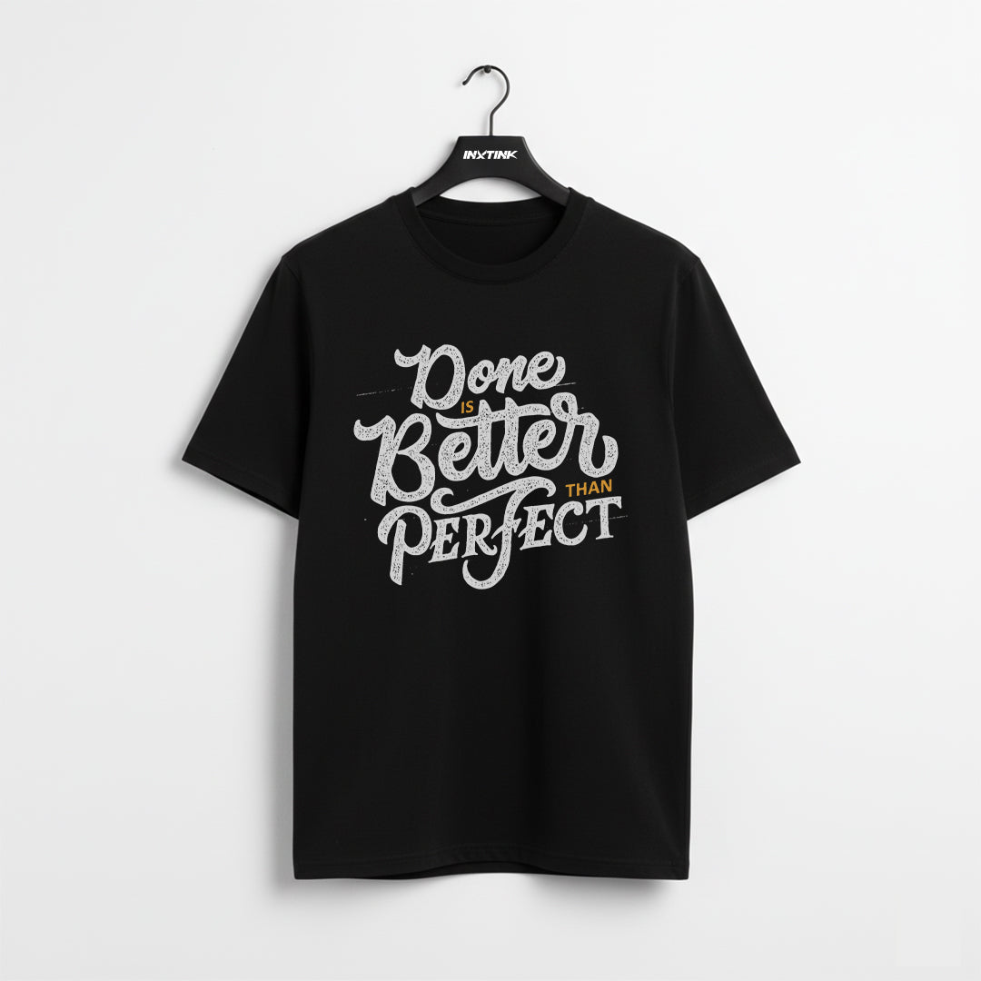 Regular fit 100% cotton black T-shirt featuring a vintage-inspired text design with the quote βDone Is Better Than Perfect.β