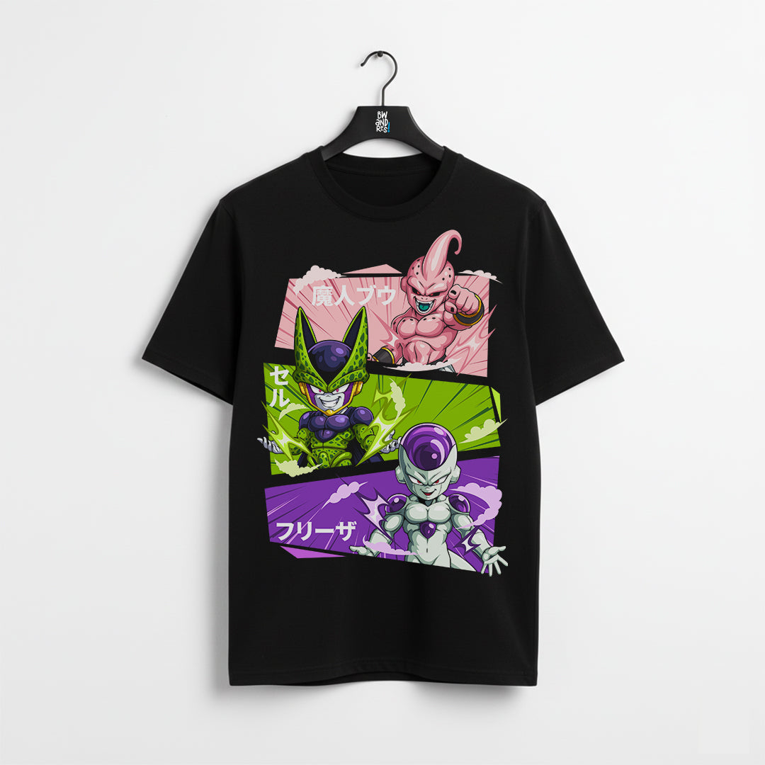 Regular fit 100% cotton shirt, classic black, ideal for anime fans. It features a vibrant, full-color design inspired by Dragon Ball Z, featuring the saga's most iconic villains: Majin Buu, Cell, and Frieza, each in a dynamic, Japanese comic-style style. A must-have for collectors and anime lovers. Designed by BW Andres.