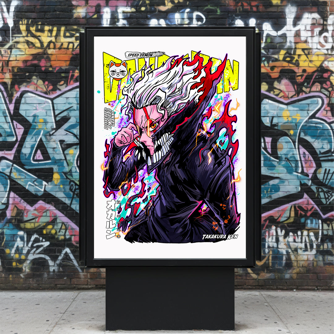Presentando a Takakura Ken en un audaz estilo manga, con ardientes efectos de neón y líneas de energía intensas que hacen que el diseño se destaque.